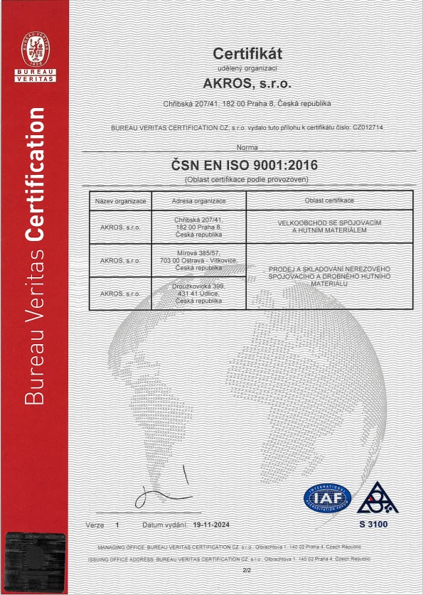 AKROS s.r.o. je držitelem certifikátu dle ČSN EN ISO 9001:200K získání tohoto certifikátu nás vedla snaha o optimalizaci a zlepšování provozních procesů. Toto zlepšování má za cíl dosažení maximální spokojenosti našich zákazníků.