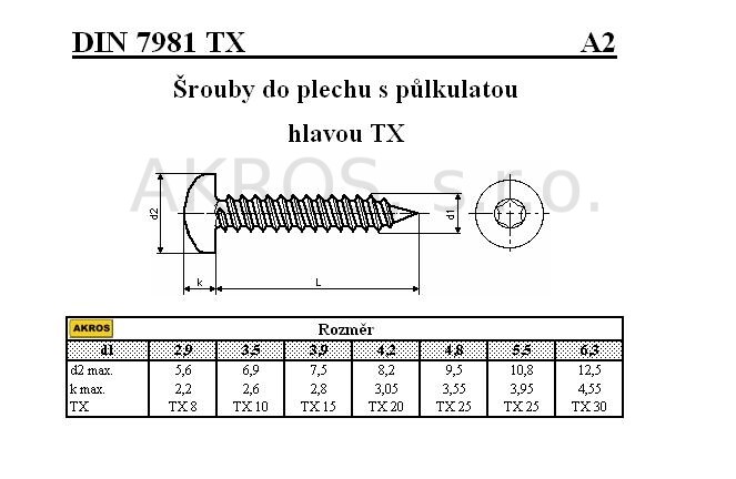 ŠROUBY DO PLECHU S PŮLKULATOU HLAVOU S DRÁŽKOU TORX DIN 7981TX/A2