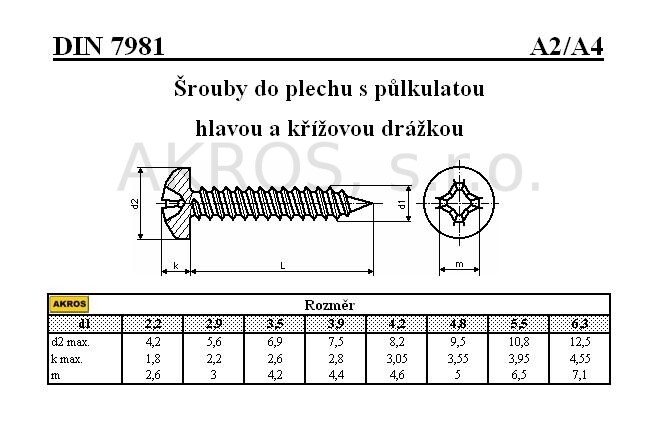 ŠROUBY DO PLECHU S PŮLKULATOU HLAVOU S KŘÍŽOVOU DRÁŽKOU DIN 7981C/A4