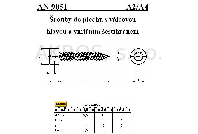 ŠROUBY DO PLECHU S VÁLCOVOU HLAVOU S VNITŘNÍM ŠESTIHRANEM AN 9051/A4
