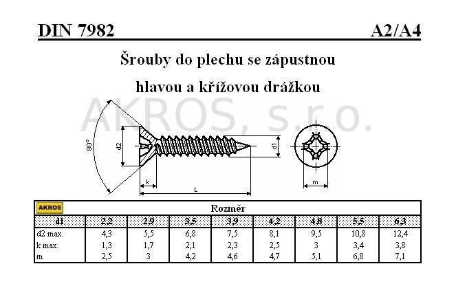 ŠROUBY DO PLECHU SE ZÁPUSTNOU HLAVOU S KŘÍŽOVOU DRÁŽKOU DIN 7982C/A2