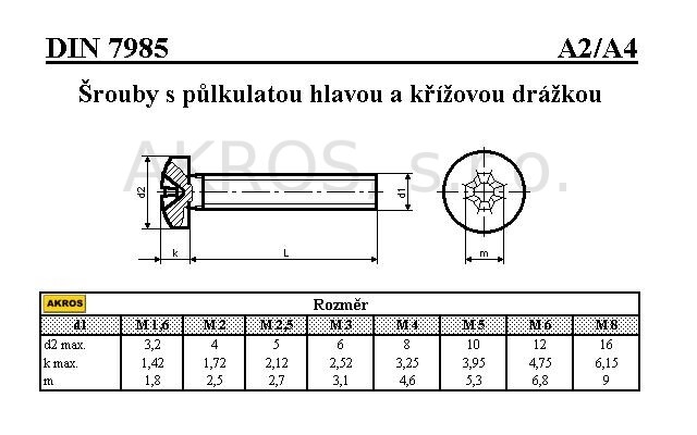 ŠROUBY S PŮLKULATOU HLAVOU S KŘÍŽOVOU DRÁŽKOU PHILIPS DIN 7985/A4