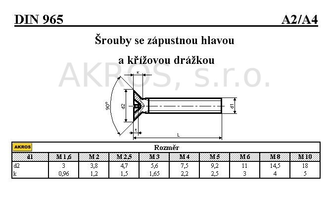 ŠROUBY SE ZÁPUSTNOU HLAVOU S KŘÍŽOVOU DRÁŽKOU POZIDRIV (Z) DIN 965/A2