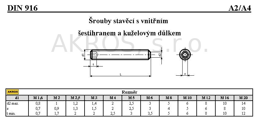 ŠROUBY STAVĚCÍ S VNITŘNÍM ŠESTIHRANEM A KUŽELOVÝM DŮLKEM DIN 916/A2